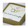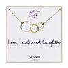 14k gold filled chain and 24k gold vermeil Pendant on “Love, Luck & Laughter” message card.
